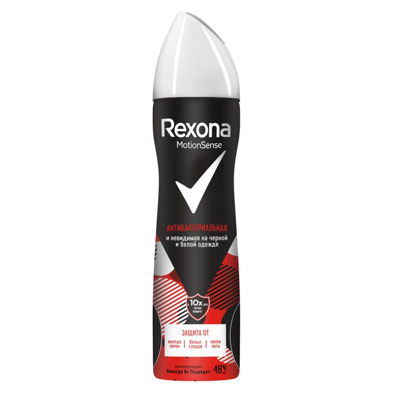 Дезодорант - антиперспирант - спрей Rexona Антибактериальная и невидимая на черной и белой одежде с технологией двойной защиты: нет поту, нет запаху, нет белым следам на черном и желтым пятнам на белом. В его формуле достигнут оптимальный баланс: концентрация активного компонента делает формулу невидимой на коже и одежде без ущерба эффективности против бактерий, которые являются причиной неприятного запаха. Он обеспечивает в 10 раз более эффективную защиту против бактерий*, вызывающих неприятный запах, а также бережно относится к нежной коже подмышек. Насладись сверкающим ароматом в духе времени: сочные нотки груши и ягод, окутанные свежим цветочным букетом из розы, фиалки и жасмина в обрамлении мягких сандаловых оттенков. Благодаря антибактериальному эффекту на 48 часов и свежему и стойкому аромату ты будешь полностью контролировать ситуацию. Устрани причину неприятного запаха и поддерживай свой стиль незапятнанным – без белых и желтых следов, а также влажных пятен от пота на одежде. Играй по своим правилам. Оставайся активной и уверенной в себе.