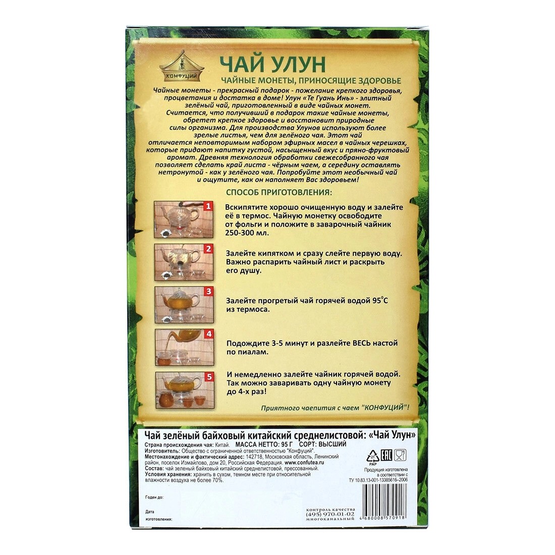 Чай приготовлен по древней технологии и относится в Китае к "бирюзовым чаям". Свежие чайные листья обрабатывают таким образом: край листа – черный чай, а середина листа – зеленый. При изготовлении чая используют зрелые чайные листья с богатым содержанием эфирных масел, что придает чаю насыщенный густой продолжительный вкус.