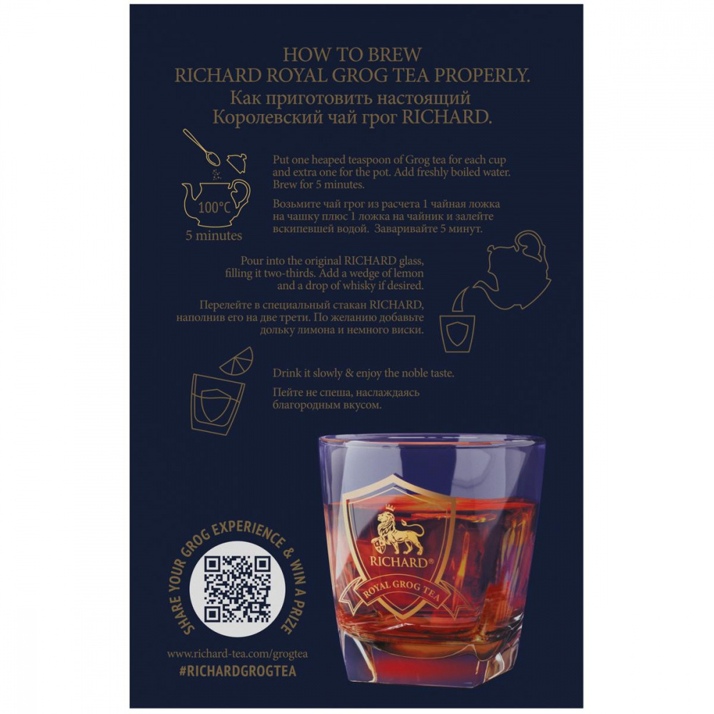 Подавайте Royal Grog Tea в оригинальном стакане RICHARD, добавив по желанию дольку лимона и немного виски.