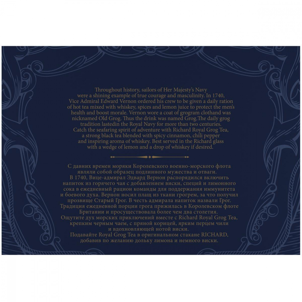 Ощутите дух морских приключений вместе с Richard Royal Grog Tea, крепким черным чаем, с пряной корицей, ярким перцем чили и вдохновляющей нотой виски.