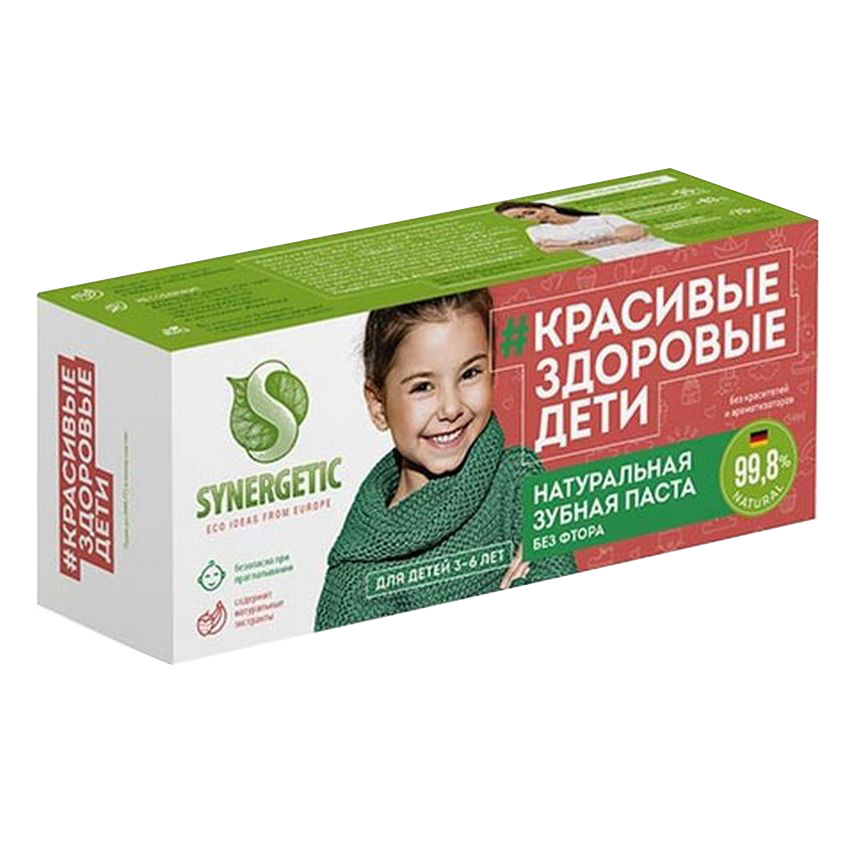 Натуральная зубная паста для детей. Безопасная и эффективная паста без фтора, ароматизаторов и красителей. В формуле пасты содержатся только натуральные компоненты и полезные экстракты липы, клубники и банана. Активный компонент пасты лактат кальция регулирует фосфорно-кальциевый обмен, восполняет дефицит ионов кальция в ротовой полости и оказывает противовоспалительное действие. Паста не содержит красители и ароматизаторы, фтор, ГМО, SLS, SLES, парабены, продукты нефтепереработки, триклозан, сахарин, агрессивные абразивы и безопасна при случайном проглатывании.