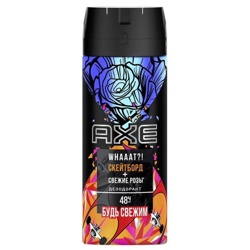 Дезодорант Axe Скейтборд и розы - это защита от запаха пота на 48 часов + сногсшибательно свежий аромат, пробуждающий утром, бодрящий в течение дня и освежающий вечером. Дезодорант эффективно защищает от неприятного запаха и дарит свежесть надолго. Не оставляет следов и пятен на одежде и не блокирует потовые железы. Просто встряхни баллон в течение 2-3 секунд и распыли дезодорант Axe на кожу с расстояния 15 сантиметров. Использование дезодоранта поможет тебе раскрыть свою индивидуальность и оставаться неподражаемым на протяжении всего дня!