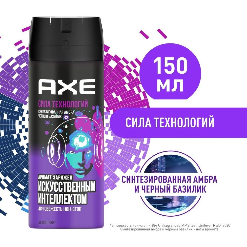 Эй, Бро, некогда объяснять! У нас в AXE наметилось серьезное противостояние. Есть две стороны силы, две ярких коллекции ароматов, и пора выбирать свою. Ты можешь довериться технологиям или сделать выбор в пользу природы. Чтобы принять правильное решение, стоит попробовать все! Линейка AXE Сила джунглей — это атмосфера диких тропических лесов Амазонии. AXE Сила технологий заряжена искусственным интеллектом. Звучит интригующе? Еще бы! Дезодорант аэрозоль AXE Сила технологий разрабатывался не так, как другие продукты AXE. К нашей команде парфюмеров на время присоединился искусственный интеллект. С его помощью мы оценили, какие ноты чаще выбирают мужчины —- и создали на их основе аромат, который точно никого не оставит равнодушным. Итогом и стал мужской дезодорант AXE: яркий, дразнящий и многогранный. Микс из пряных, древесных и сладких нот подойдет тем, кто готов оказываться в центре внимания вновь и вновь. Аромат с первого вдоха окутывает тебя аккордами кориандра, имбиря и черного базилика, чтобы почти сразу смягчить это брутальное начало экзотическими нотами кашемирового дерева, кориандра и корицы. Дольше всего на коже ощущаются запахи сандалового дерева, амбры и ванили. Дезодорант с ароматом амбры и базилика раскрывается постепенно, в течение дня становясь все мягче и притягательнее. Каждый вдох открывает в нем новые грани, а полную картину ты сможешь увидеть, только если доверишь AXE заботу о своем безупречном образе. Кстати об этом: наноси дезодорант AXE сразу после душа, на чистую и сухую кожу, чтобы забыть о запахе пота на 48 часов. Технология 2в1 обеспечит тебе полную уверенность в этом — а еще топовый’’ аромат. И обязательно обнови защиту, если сходил в душ после тренировки… или чего-то более увлекательного. Настало время решать — AXE Сила технологий ждет твоего вердикта!