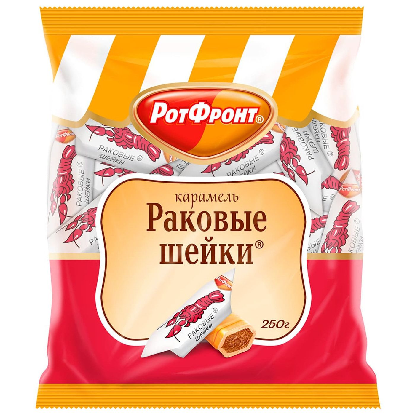 Карамель "Раковые шейки" – знаменитые конфеты фабрики "Рот Фронт". Полосатые карамельные подушечки с шоколадно-ореховой начинкой из отборного жаренного миндаля с какао получили свое странное название за свое внешнее сходство с аппетитными хвостиками раков, называемых в старину "раковыми шейками". Ароматные, с насыщенным орехово-шоколадным вкусом, с хрустящими тонкими слоями карамели.