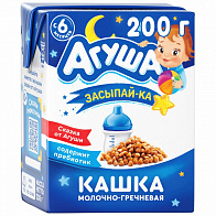 Каша гречневая "Агуша" Засыпай-ка молочная готова к употреблению, благодаря удобной упаковке ее можно взять с собой на прогулку. Содержит пребиотик, отлично насыщает и помогает малышу легко и быстро уснуть. Изготовлена без применения сухого молока. С 6-ти месяцев.