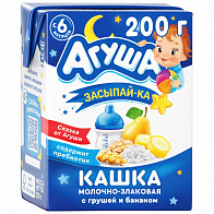 Каша злаковая "Агуша" Засыпай-ка молочная с грушей и бананом готова к употреблению, благодаря удобной упаковке ее можно взять с собой на прогулку. Содержит пребиотик, отлично насыщает и помогает малышу легко и быстро уснуть. Изготовлена без применения сухого молока. С 6-ти месяцев.
