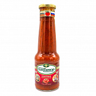Густой острый кетчуп с кусочками овощей и букетом восточных специй и трав: кориандром, укропом и перцем. Такая смесь специй и томатов особенно хорошо сочетается с блюдами из баранины. Острые нотки кетчупа не перебивают вкус блюда, но дополняют его вкус. Без консервантов, ароматизаторов, ГМО и красителей. – Этот кетчуп особенно хорош в качестве маринада для баранины. Состав продукта: вода питьевая, томатная паста, сироп глюкозно-фруктозный, уксус столовый, загуститель E1442, соль, укроп, кориандр, перец чили, подсластитель сахарин (натриевая соль). Массовая доля растворимых сухих веществ не менее 18 %.
