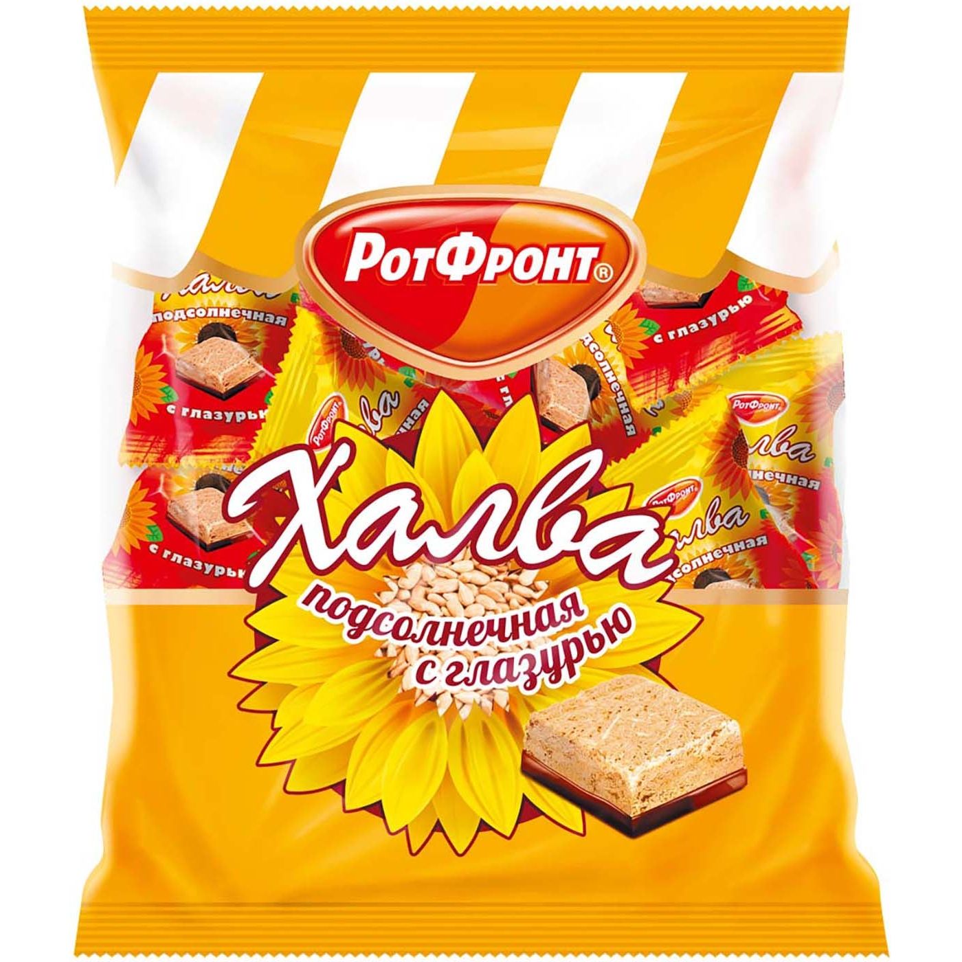 Подсолнечная халва на глазированном донышке от фабрики "Рот Фронт". Ароматные квадратики халвы, покрытые шоколадом лишь со стороны донышка. Утонченное сочетание подсолнечной халвы и шоколадной глазури: насыщенный вкус подсолнечных семечек и ненавязчивая шоколадная сладость. Конфеты для настоящих сладких гурманов. Состав: ядра семян подсолнечника тертые, патока, шоколадная глазурь (сахар, какао тертое, эквивалент масла какао (растительные негидрогенизированные масла (пальмовое, ши, иллипе, подсолнечное)), какао-порошок, эмульгаторы: лецитин соевый, E476, ароматизатор "ванильный"), сахар, вода питьевая, семена кунжута тертые, пенообразователь экстракт солодкового корня, антиокислитель аскорбиновая кислота, ароматизатор "ванильный", соль.