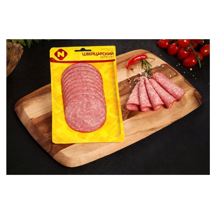 Колбаса копчено-вареная Останкино "Сервелат | Швейцарский" родом из города Базель, где в 19 веке придумали ныне классический рецепт, в котором используется свинина, говядина приправы и лед. Насыщенный мясной вкус, тонкий аромат пряностей – визитная карточка этого сервелата. Заботливая хозяйка знает, что нарезанный тонкими кружками сервелат, декорированный томатами и зеленью, сможет украсить праздничный стол и станет прекрасной закуской как чистом виде, так и в канапе с оливками, томатами черри, белым хлебом и кусочком сыра.