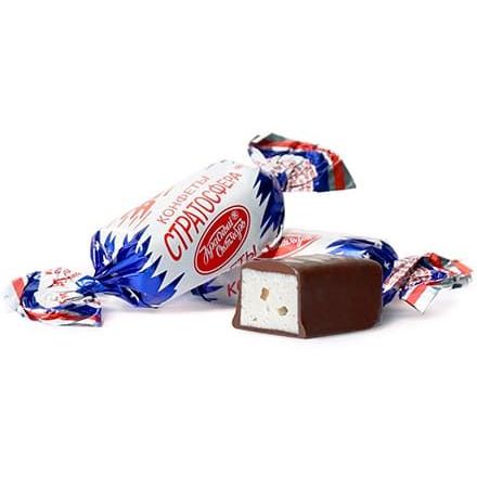 Конфеты "Стратосфера" – одни из тех, которые называют легендарными. Со времен СССР их оформление и вкус ничуть не изменились: все то же нежное суфле в котором, как осколки метеоритов в пушистых облаках, утоплены кусочки дробленых миндальных орехов. Стройный кирпичик конфеты покрыт щедрым слоем шоколадной глазури.