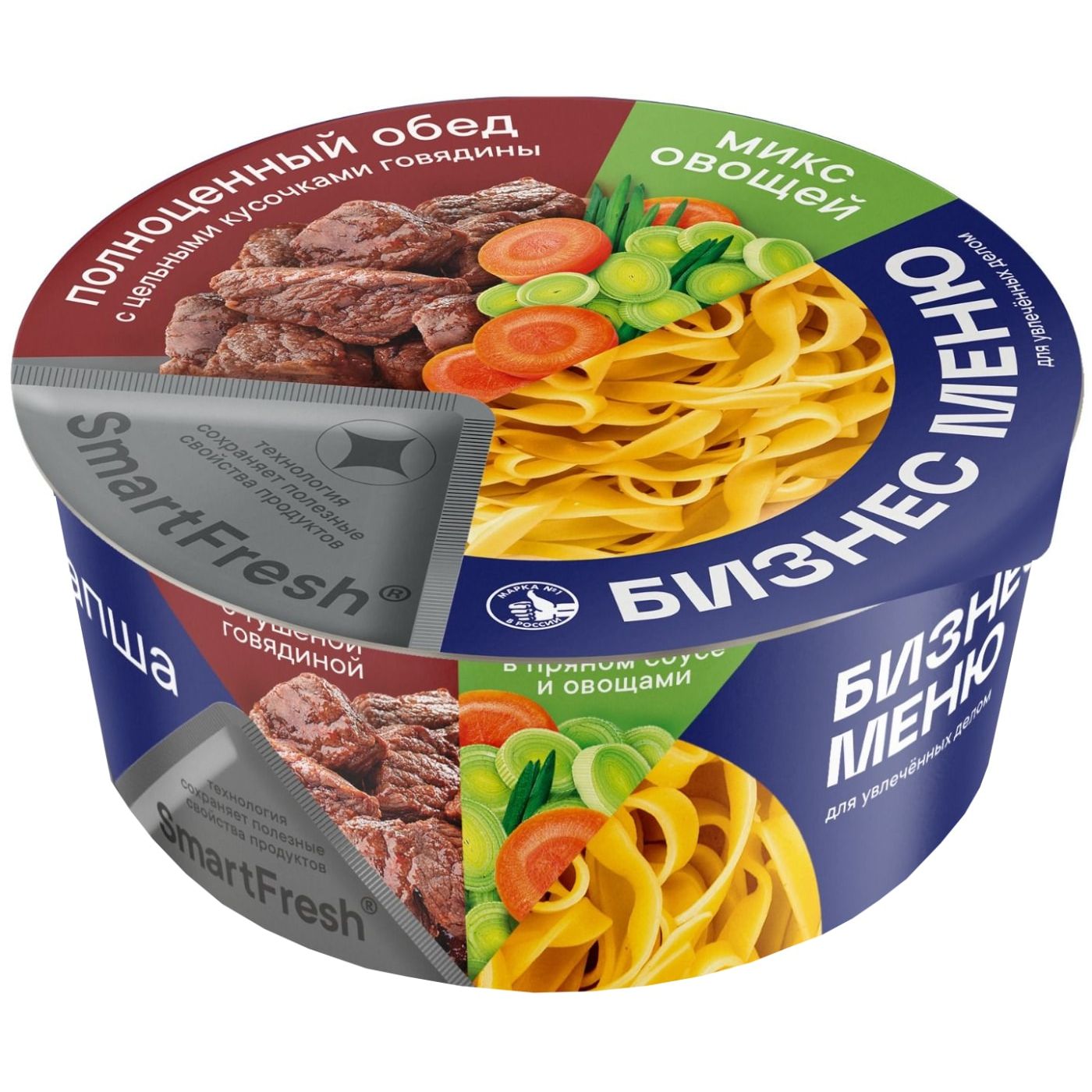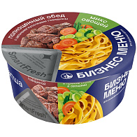 Полноценный обед Бизнес меню с натуральным мясом и овощами, сохранившими свои полезные свойства благодаря инновационной технологии Smart Fresh. Не рекомендуется употреблять в сухом виде. Состав: лапша: мука пшеничная хлебопекарная высшего сорта, масло растительное, соль поваренная пищевая, разрыхлитель – натрий двууглекислый, приправа: соль поваренная пищевая, сахар-песок, усилитель вкуса – глутамат натрия, ароматизатор идентичный натуральному "Говядина", чеснок, перец черный, регулятор кислотности - кислота лимонная, перец красный, смесь сушеных овощей: морковь, капуста сушеная, перец.