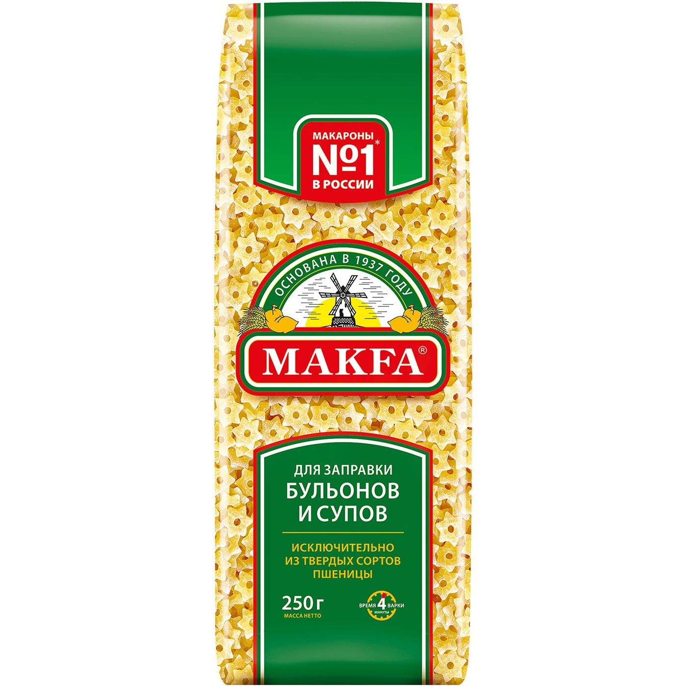 Макароны Makfa Звездочки производятся по классическому рецепту из крупки твердых сортов пшеницы (дурум) и чистой воды. При варке они сохраняют форму и полезные свойства зерна. Маленькие звездочки – это короткий формат пасты, который лучше всего подходит для приготовления супов, творожных и овощных запеканок, а также гарнира для детских блюд. Чтобы получить правильную текстуру al dente, макароны следует варить в кипящей подсоленной воде в течение 2-3 минут. Продукт не содержит ГМО и соответствует стандартам ГОСТ. Без пищевых добавок и красителей. Состав: мука из твердой пшеницы для макаронных изделий высшего сорта, вода питьевая. Объем 250 г.