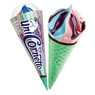 Cornetto "Единорог" — голографический рожок с бирюзовой вафлей. Радужное сочетание из жидкого соуса с пюре черной смородины, мороженого со вкусом клубники и жевательной резинки, и финальный аккорд в виде большого шоколадного кончика – это именно тот вкус, который делает классику Cornetto современной. А разнообразие упаковок с единорогами позволит каждому найти свой идеальный рожок!