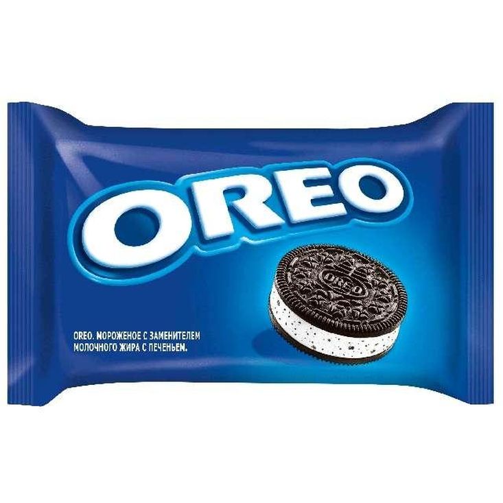Мороженое "Oreo" сэндвич – это пломбир с мелкой крошкой и дробленными орешками внутри, сделанный в виде сэндвича: то есть две черных шоколадно-кофейных печеньки, между которыми – кружок мороженого. На верхней печеньке – логотип "Oreo".