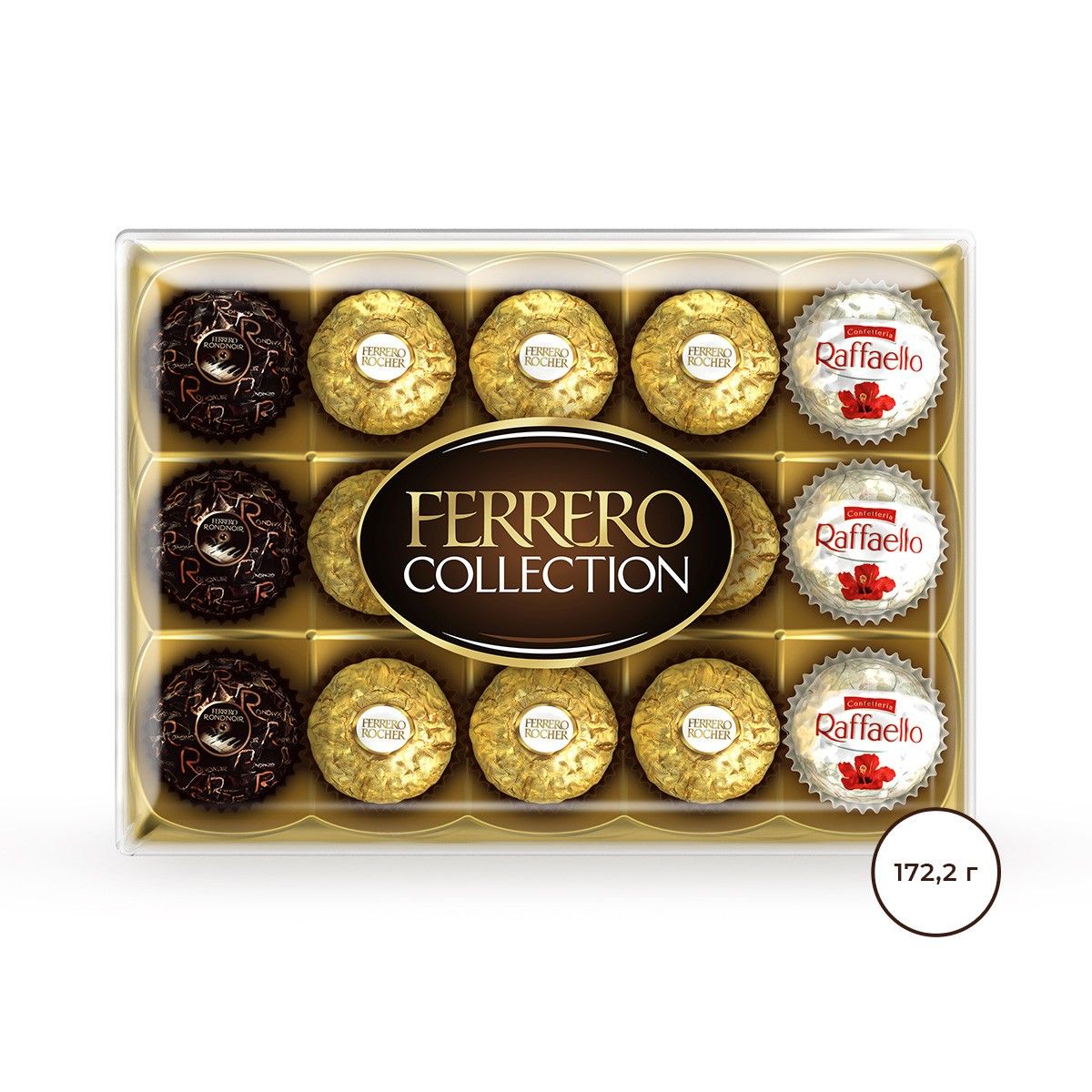 Откройте для себя ассорти любимых конфет: Raffaello, Ferrero Rocher и Ferrero Rondnoir. Набор из 15 конфет послужит идеальным подарком или прекрасным поводом разделить момент с близкими.