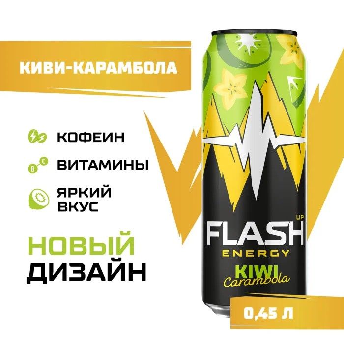 Напиток энергетический Flash Up "Киви-Карамбола", газированный, безалкогольный, тонизирующий, ж/б, 0,45 л. Состав: Вода питьевая очищенная, сахар, регуляторы кислотности: лимонная кислота и цитрат натрия, концентрат для напитков "Энергия" (таурин, мальтодекстрин, кофеин, ниацин, пантотеновая кислота, витамин B6, фолиевая кислота), комплексная пищевая добавка со вкусом киви и карамболы (ароматизатор, красители: тартразин и синий патентованный), комплексная пищевая добавка "Нейтральная эмульсия" (стабилизаторы: гуммиарабик и E445, терпены, антиокислитель E320), подсластители: ацесульфам калия, цикламат натрия, сахаринат натрия, консерванты: сорбат калия и бензоат натрия.