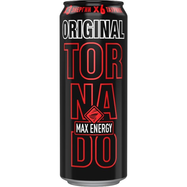 Напиток энергетический Tornado "Max Energy | Original", безалкогольный, ж/б, 0,45 л. Состав: Подготовленная вода, сахар, регуляторы кислотности кислота лимонная и цитрат натрия, ароматизаторы, краситель сахарный колер IV, таурин, кофеин, консервант бензоат натрия, витамины: пантотеновая кислота (В5), В6, фолиевая кислота (Вс), ниацин (РР).