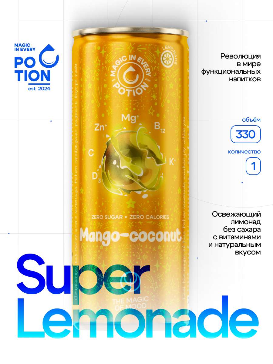 Откройте для себя Potion Super Lemonade — революционный функциональный напиток, который сочетает в себе вкус манго и кокоса! Объемом 0,33 л, этот освежающий лимонад не содержит сахара и калорий, что делает его идеальным выбором для тех, кто заботится о своем здоровье и фигуре. Potion Super Lemonade — это ваша здоровая альтернатива сладким газировкам. Наслаждайтесь освежающим эффектом и поддерживайте свое здоровье в любой ситуации. Выберите Potion Super Lemonade и сделайте шаг к более здоровой жизни! Преимущества Potion Super Lemonade: Яркий вкус: Насыщенный и сочный вкус манго и кокоса вернет вас в беззаботные летние дни. Без сахара и калорий: Наслаждайтесь освежающим вкусом без чувства вины — ноль сахара и калорий! Богатый комплекс витаминов: Напиток содержит витамины и минералы, поддерживающие ваш иммунитет и общее самочувствие. Идеально для активных людей: Отличный выбор для пикников, работы или отдыха — всегда под рукой! Напиток содержит: Дигидрокверцетин антиоксидант натурального происхождения, содержится в комлевой части даурской лиственницы и других хвойных деревьев, в древесине черешни, в семенах расторопши. Считается одним из самых сильных антиоксидантов, уменьшает проницаемость и ломкость капилляров, предотвращает образование тромбов, регулирует кислотно-основной баланс, содержание ферментов в организме, всасывание витамина С; Магний один из важнейших внутриклеточных макроэлементов в организме. Магний является жизненно-важным элементом, который находится во всех тканях организма и необходим для нормального функционирования клеток. Участвует в большинстве реакций обмена веществ, в регуляции передачи нервных импульсов и в сокращении мышц, оказывает спазмолитическое и антиагрегантное действие; Цинк необходим для продукции спермы и мужских гормонов, необходим для метаболизма витамина E, важен для нормальной деятельности простаты, участвует в синтезе разных анаболических гормонов в организме, включая инсулин, тестостерон и гормон роста, необходим для расщепления алкоголя в организме, так как входит в состав алкогольдегидрогеназы; Калий играет важную роль для нормального функционирования организма. Он участвует во многих биохимических процессах, помогает сокращаться скелетным мышцам, участвует в процессе ощелачивания мочи, нормализует кровообращение, улучшает мозговую деятельность, питая мозг кислородом и воздействуя на ускорение передачи нервных импульсов; Янтарная кислота участвует в процессе усвоения клетками кислорода и обеспечения клеточного дыхания, транспорта микроэлементов, синтеза белка, производства новых клеток нервной и иммунной систем. Пищевая ценность на 100 мл: Энергетическая ценность 0 ккал / 0 кДж, белки – 0 г, жиры – 0 г, углеводы – 0 г, общие сахара – 0 г. Действующие вещества и витамины в составе: Магния цитрат, Цитрат цинка, Цитрат калия, Янтарная кислота, Дигидрокверцетин, Витамин C, Витамин B1, Витамин B2, Витамин B3 (PP), Витамин B5, Витамин B6, Витамин B7, Витамин B8, Витамин B9, Витамин B12, Витамин D3. Potion Super Lemonade — это не просто напиток, это ваш шаг к здоровью и благополучию. Пейте с умом и живите полной жизнью! Potion — Зарядитесь энергией с умом!" Условия хранения t° от 0 до +25°С Состав вода, регуляторы кислотности (лимонная кислота, цитрат калия), магния цитрат, витамин B8 (инозитол), ароматизаторы пищевые, консерванты (сорбат калия, бенз