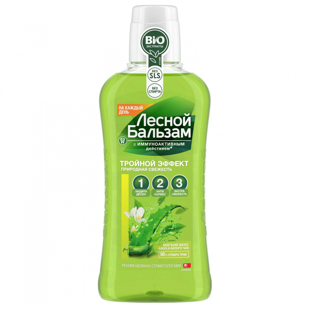 Профилактический ополаскиватель для полости рта Лесной бальзам Тройной эффект с экстрактами алоэ и белого чая имеет самый мягкий вкус в линейке ополаскивателей Лесной бальзам и сочетает в себе сразу 3 действия, позволяя достичь максимальной защиты всей полости рта: Укрепляет десны, нормализует обменные процессы в мягких тканях полости рта благодаря запатентованной формуле на отваре трав с соком алоэ и экстрактом белого чая; Защищает от кариеса и укрепляет эмаль за счет минерального комплекса с фтором; Сохраняет дыхание свежим и защищает от образования налета в течение дня за счет масла мяты; Поддерживает баланс микрофлоры полости рта. Клинически доказано: ежедневное использование серии Тройной эффект (зубная паста + ополаскиватель) в 3 раза снижает образование налета на зубах – основной причины кариеса и проблем десен.