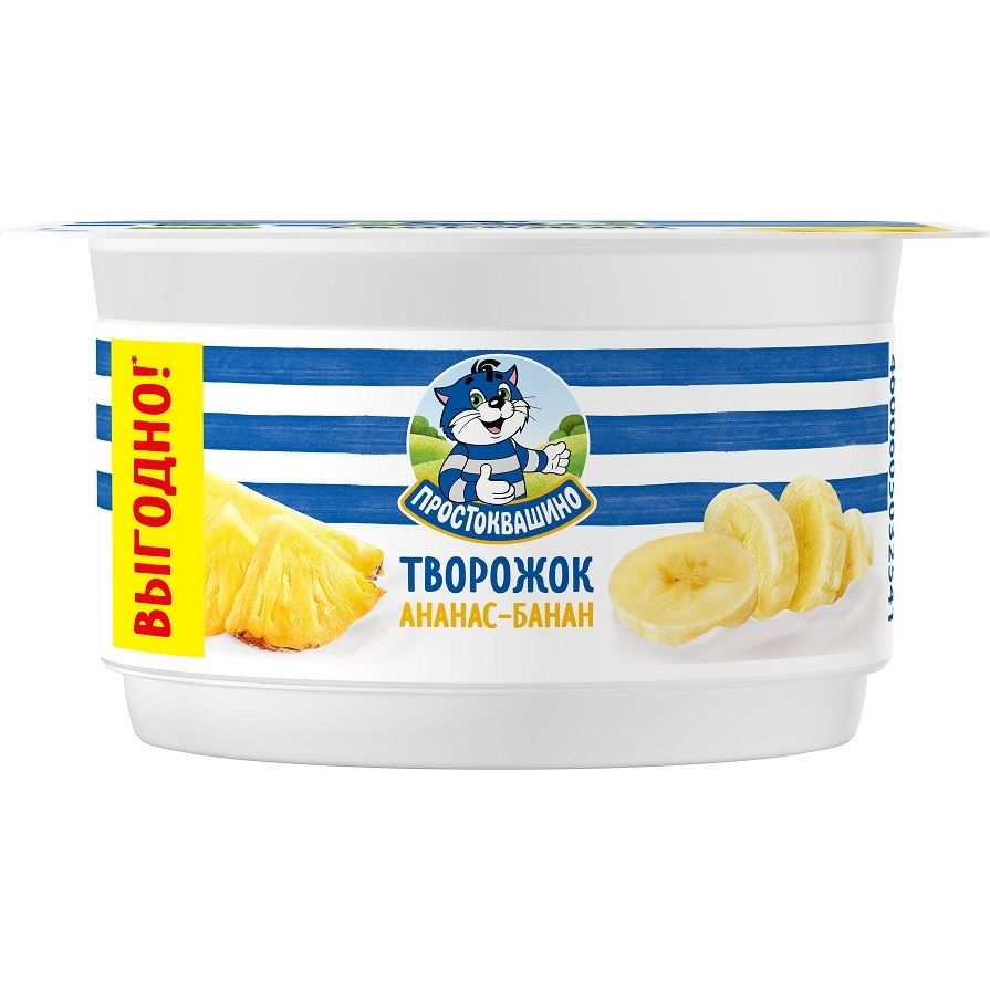 Попробуйте новый творожок Простоквашино в выгодном формате - невероятное сочетание творога, сливок и ананаса с бананом! Творожок обладает идеальной мягкой текстурой, густотой и нежным сливочным вкусом и содержит только натуральные ингредиенты! Идеально для завтрака или перекуса. Состав: творог обезжиренный, нормализованные сливки, наполнитель (вода, сахар, кукурузный крахмал, ананас, пюре банана, натуральные ароматизаторы, концентрированный сок лимона, краситель – каротины), сахар.