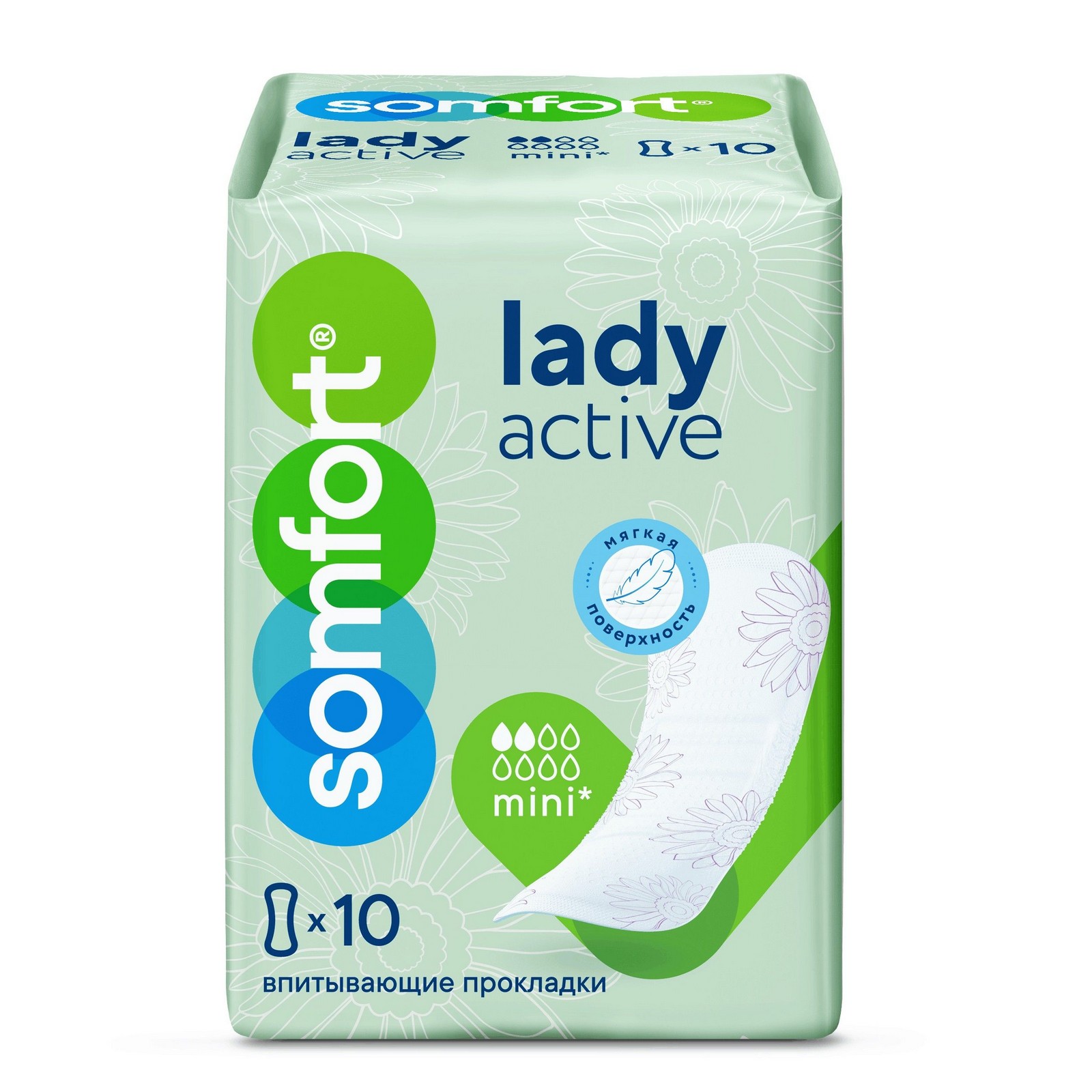 Somfort Lady Active Mini (Сомфорт Леди Актив Мини) — компактные впитывающие прокладки, созданные для защиты при недержании легкой (капельной) степени. Благодаря гранулам суперабсорбента в составе впитывающего слоя быстро поглощают влагу, удерживая ее внутри прокладки, и нейтрализуют запах. Мягкая поверхность дарит ощущение комфорта.