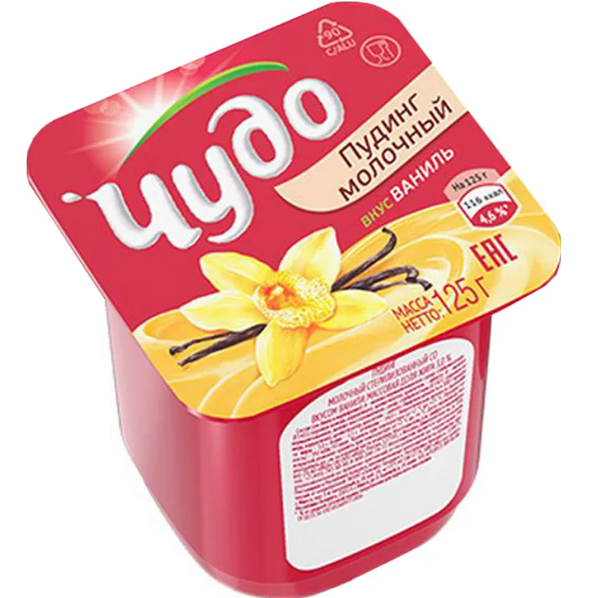 Удивительно вкусный пудинг, приготовленный на основе натурального молока с разными вкусами – ванильный, шоколадный и карамельный. Пудинг "Чудо" - восхитительный десерт! О бренде: "Чудо" – лидер рынка современных молочных продуктов и любимая молочная марка российских потребителей. С 1998 года "Чудо" радует российские семьи разнообразными, удивительно вкусными йогуртами и молочными десертами. С ярким фруктовым вкусом "Чудо" так легко проявить тепло и заботу о близких. Даже детям! Любой день важно начинать с отличного завтрака, это время, когда можно создать особенные моменты семейного тепла, задать позитивный настрой: с "Чудо" любое утро будет добрым и солнечным! "Для нас, как для производителя, важно качество продукции, которую мы производим, мы используем только высококачественные ингредиенты: натуральное молоко, разнообразные сочетания сочных фруктов и ягод".
