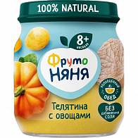 Новинка от бренда "ФрутоНяня" - пюре из телятины с овощами для питания детей раннего возраста! Мясо - источник полноценного животного белка. В нем содержатся незаменимые аминокислоты, витамины и минеральные вещества.Новое пюре о ФрутоНяня Телятина-овощи это:полноценный обед из легко усвояемого нежного мяса телятины и любимых детьми овощей (тыква, морковь, картофель) 100% натуральное пюре из отборного сырья с нежной текстуройбез добавления соли!