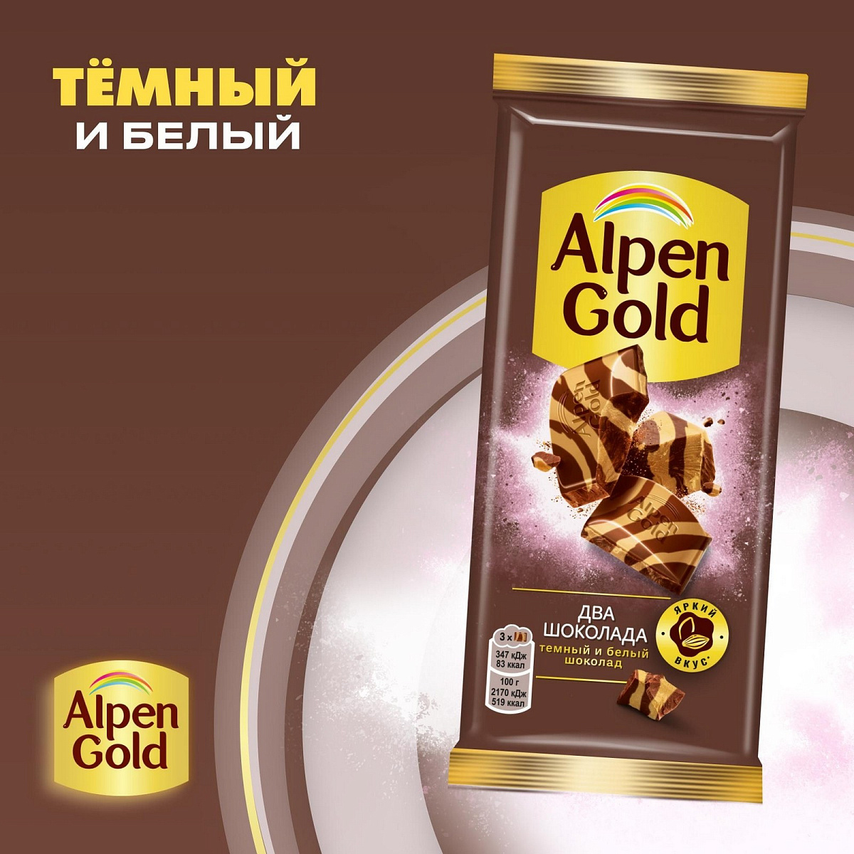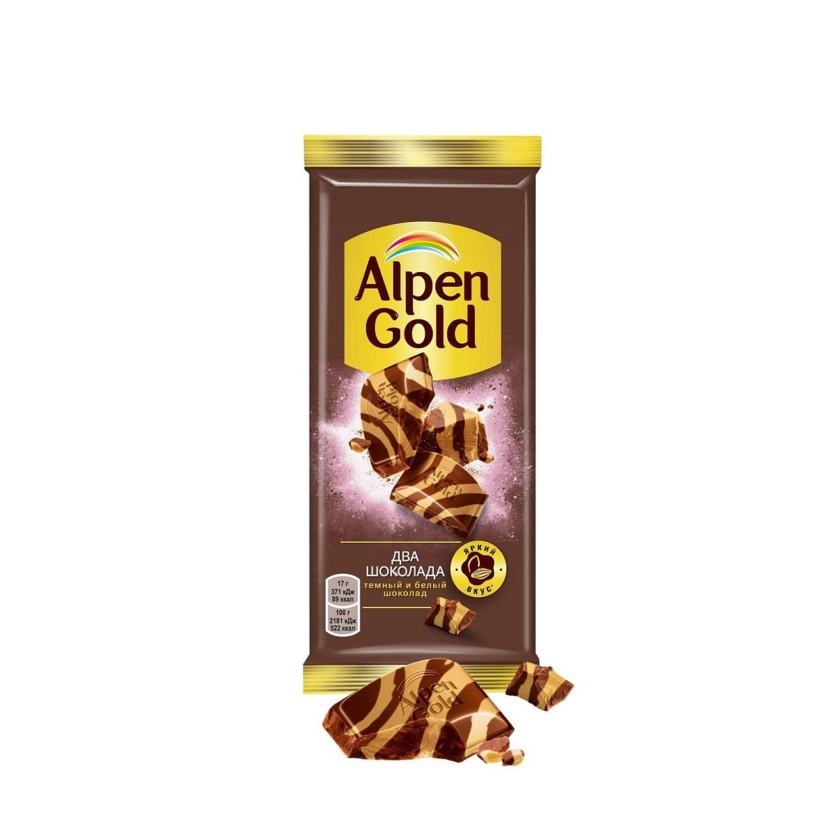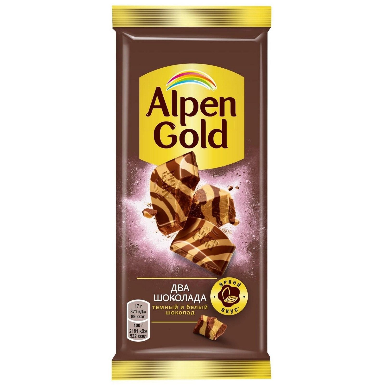 Когда белый шоколад встречается с тёмным, получается не только красив, но и по-особому вкусно: темная горчинка плюс белая элегантность – получается очень утонченно! Оцените! Состав и производитель. Сахар, какао тертое, масло какао, сыворотка сухая молочная, молоко сухое цельное, жир молочный, эмульгаторы (лецитин соевый, Е476), ароматизатор. Может содержать следы других орехов. Пищевая ценность. Пищевая ценность. 100 г. Энергетическая ценность. 2181 кДж/ 522 ккал. Белки. 4,6 г. Углеводы. 62 г. Alpen Gold - это яркие сочетания шоколада с разными ингредиентами. Испытай вкус яркости!