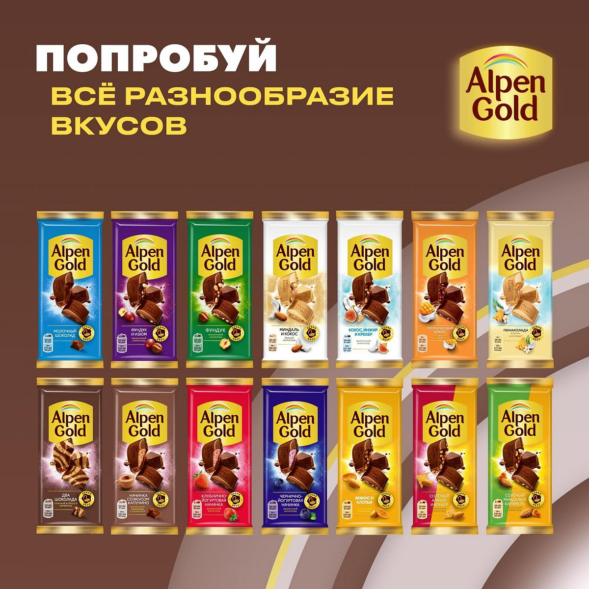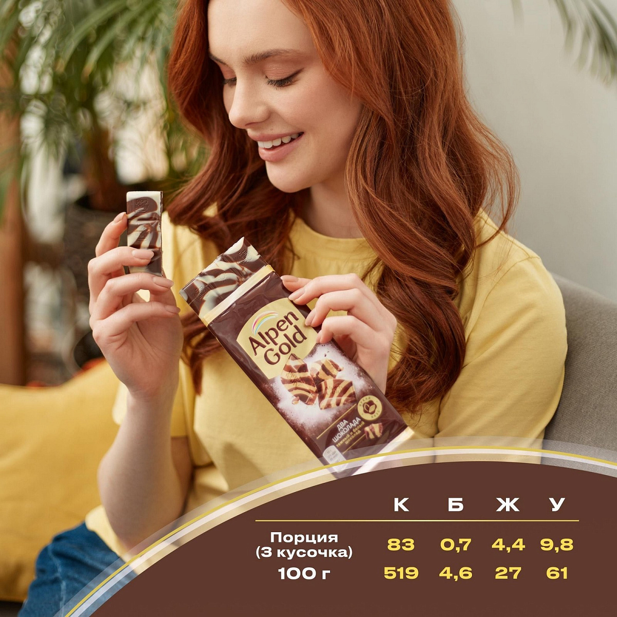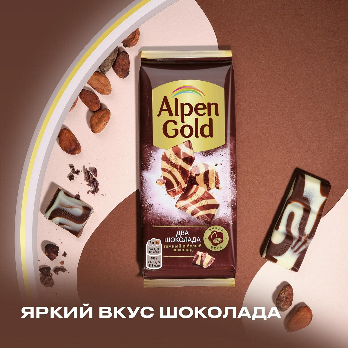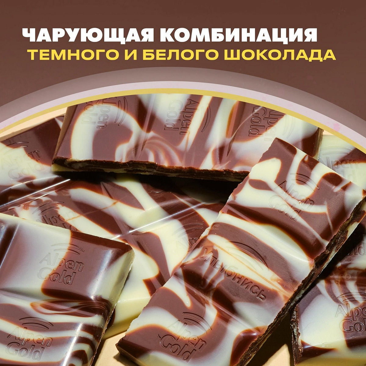 Когда белый шоколад встречается с тёмным, получается не только красив, но и по-особому вкусно: темная горчинка плюс белая элегантность – получается очень утонченно! Оцените! Состав и производитель. Сахар, какао тертое, масло какао, сыворотка сухая молочная, молоко сухое цельное, жир молочный, эмульгаторы (лецитин соевый, Е476), ароматизатор. Может содержать следы других орехов. Пищевая ценность. Пищевая ценность. 100 г. Энергетическая ценность. 2181 кДж/ 522 ккал. Белки. 4,6 г. Углеводы. 62 г. Alpen Gold - это яркие сочетания шоколада с разными ингредиентами. Испытай вкус яркости!