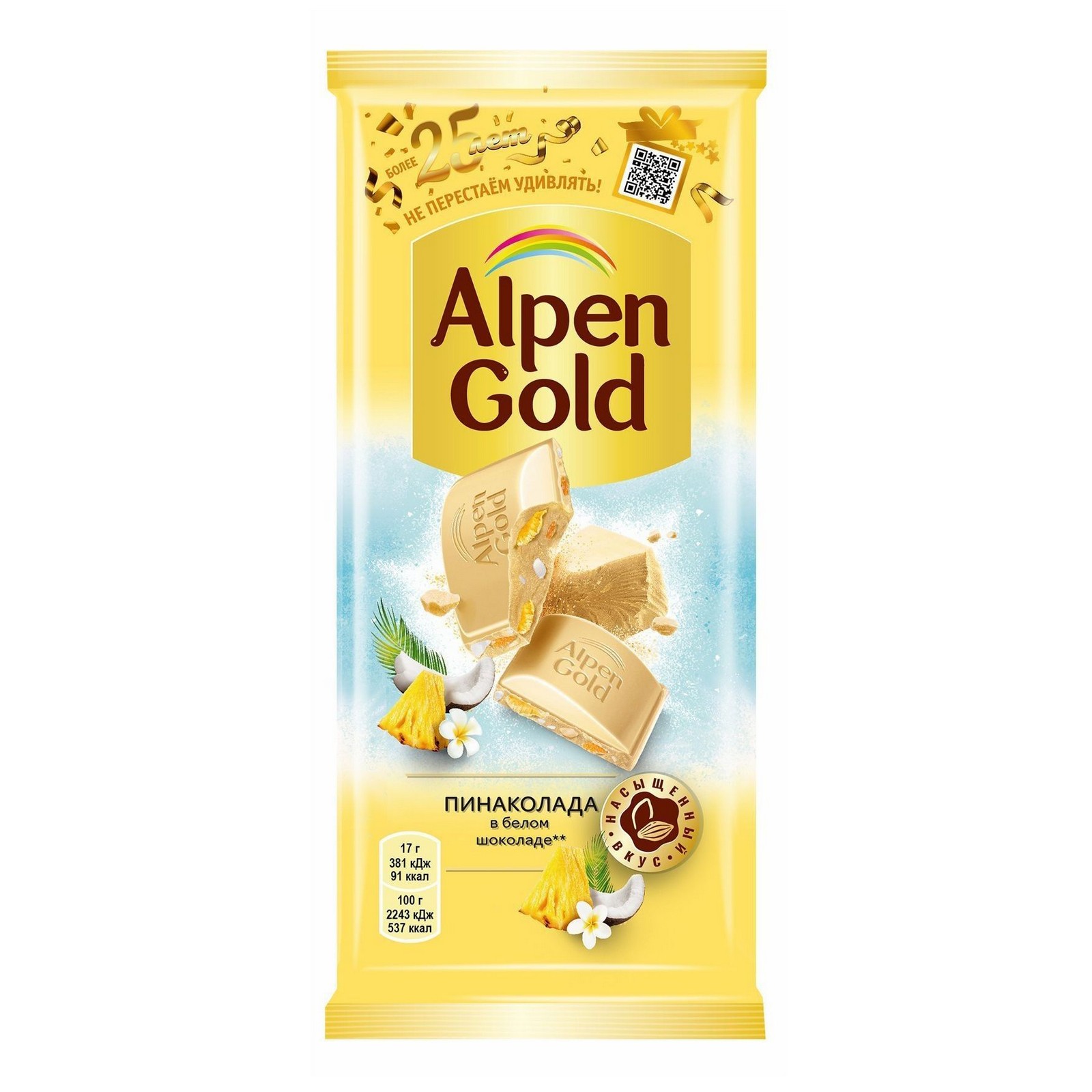 Шоколад белый "Альпен Гольд" "Пинаколада в белом шоколаде" c фруктовыми кусочками со вкусом манго, ананаса, маракуйи, с кокосовой стружкой и воздушным рисом. Создай настроение по вкусу вместе с Alpen Gold! Alpen Gold уже более 25 лет радует ценителей шоколада необычными вкусовыми сочетаниями. В широком ассортименте Alpen Gold представлены как классические вкусы молочного, темного и белого шоколада, так и неординарные вкусовые миксы: каждый любитель сладкого найдет среди них что-нибудь для себя. Шоколад Alpen Gold производится по высоким стандартам качества из натуральных какао-продуктов, заряжает ярким настроением и приглашает к вкусным открытиям. Шоколад с фундуком Alpen Gold в компактной упаковке легко взять с собой куда угодно: на работу, учебу, в поездку или в гости к чаю. Плитка шоколада Alpen Gold — это простой способ сделать свой день ярче и веселее, получая сладкое удовольствие от каждого кусочка, которым можно поделиться с друзьями и близкими людьми!