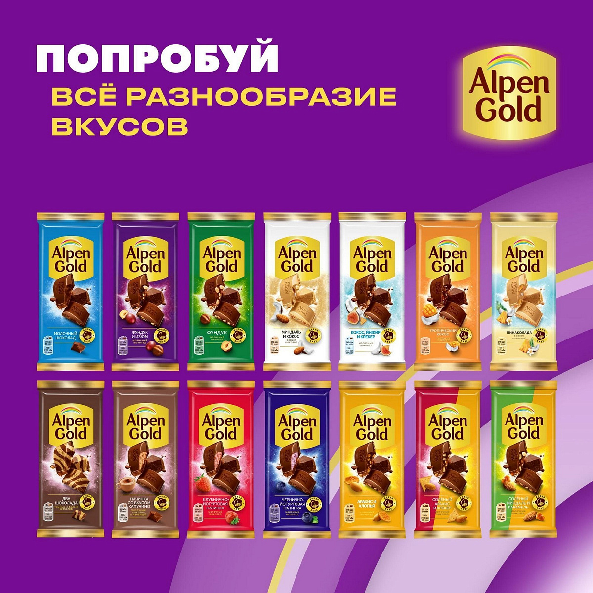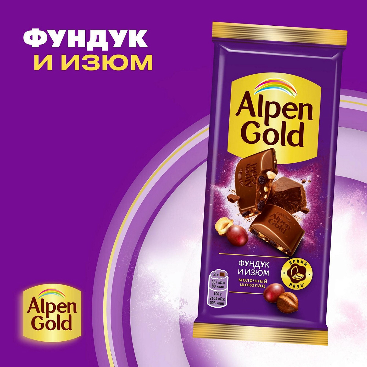 Откройте яркий вкус Alpen Gold! Ведь в молочный шоколад мы добавили все лучшее сразу – фундук и изюм! Это Разнообразие текстур впечатляет и дает восхитительный вкус. Попробуйте!