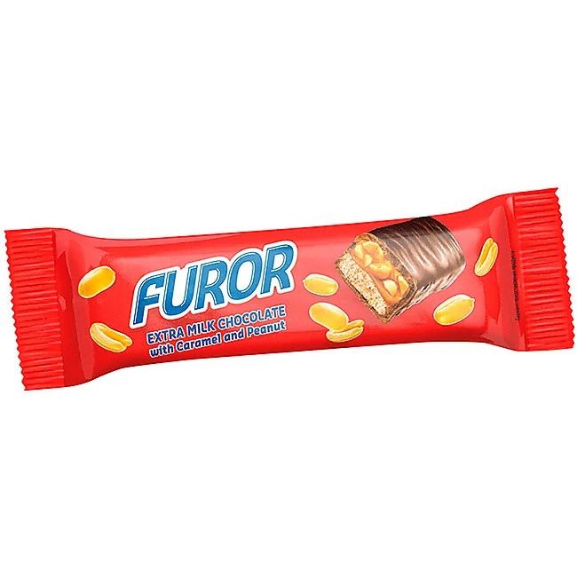 Батончик с жареным арахисом, мягкой карамелью и нугой, покрытый молочным шоколадом. Батончик на 25% состоит из настоящего молочного шоколада, в состав нуги и карамели также входит натуральный какао-порошок. В начинке много арахиса: половинки ядер добавлены в карамель, а дроблёный орех – в нежную нугу. Батончик "Furor" – отличный способ восполнить нехватку энергии в течение дня в любой ситуации: на занятиях, в офисе, на прогулке или в дороге.