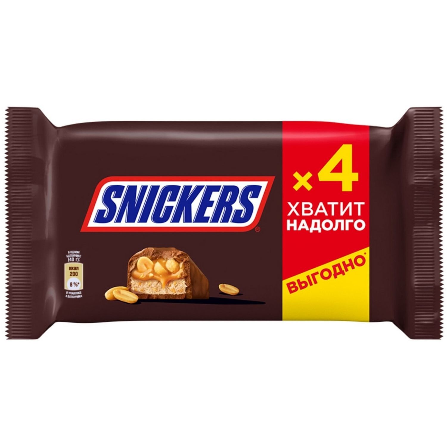 Упаковка шоколадных батончиков Snickers с жареным арахисом, нугой, карамелью и молочным шоколадом. Сладость, которую можно взять с собой в дорогу на любой случай, когда нужно вкусно зарядиться энергией. Поделитесь вкусом Snickers с друзьями, семьей или коллегами по работе. Идеален вместе с горячими напитками или под просмотр хорошего фильма. Не содержит красителей и консервантов. 4 х 40 г шоколадный батончик.