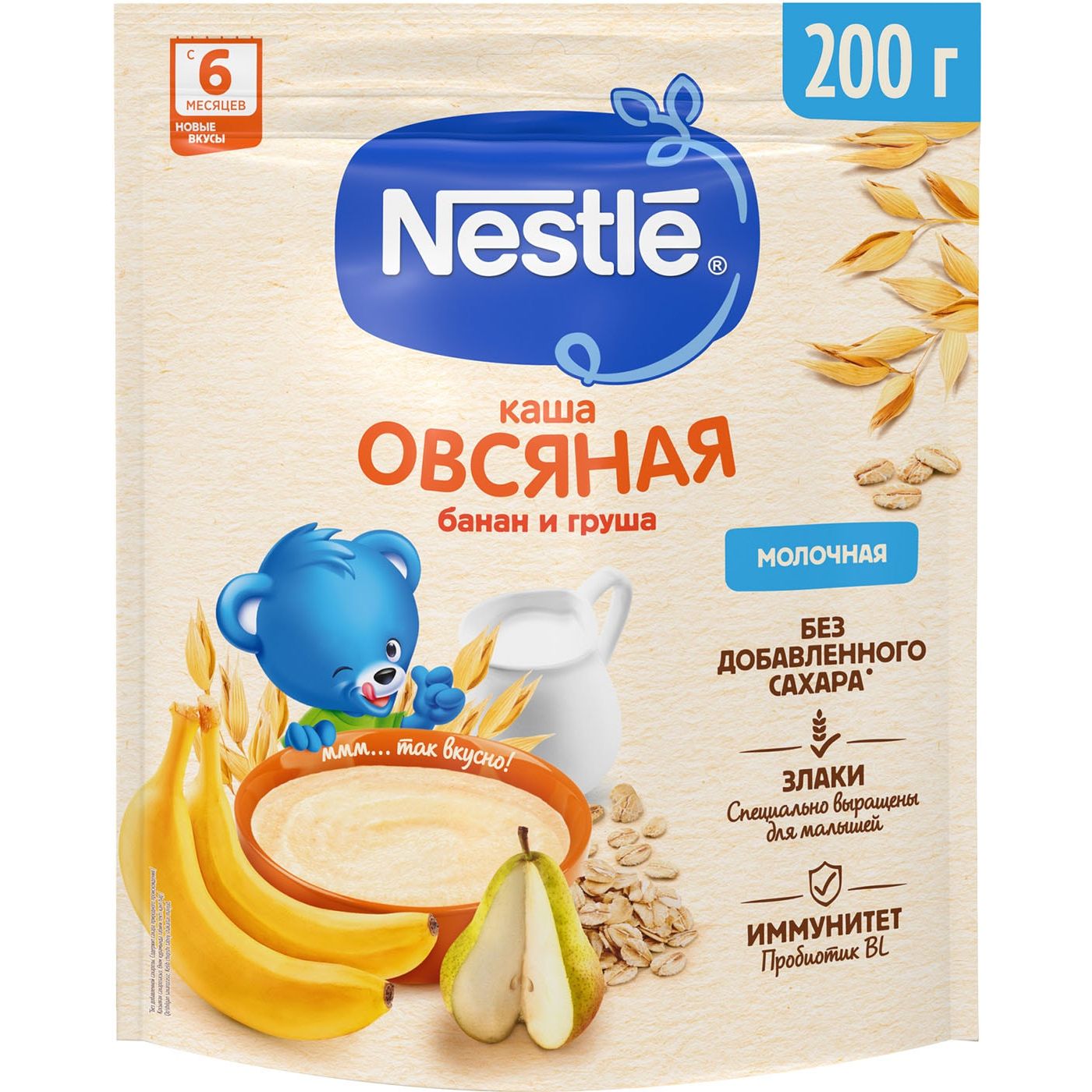 Молочная овсяная каша Nestle с грушей и бананом для детей старше 8 месяцев поможет крохе научиться жевать. Овес благотворно влияет на слизистую желудка и пищеварение в целом, а бифидобактерии способствуют улучшению и нормализации микрофлоры кишечника. Минеральные компоненты и витаминный комплекс помогут гармоничному росту и развитию малыша. Сухая смесь легко разводится, а открытая коробка может храниться до 2 недель.