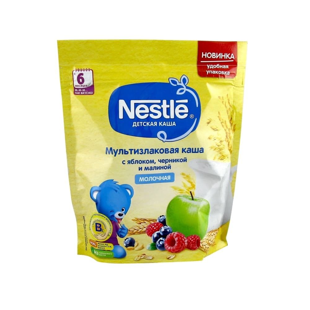 Не варить! Кашу следует готовить непосредственно перед каждым кормлением. Следуйте инструкции на упаковке. Не храните оставшуюся после кормления разведённую кашу. Молочная мультизлаковая каша с яблоком, черникой и малиной для питания детей старше 6 месяцев согласно законодательству РФ. Каша Nestlé приготовлена с использованием особой технологии бережного расщепления злаков CHE. Благодаря этому в продукте появляется естественный сладкий вкус, каша лучше усваивается и имеет повышенную пищевую ценность. Является полезным сбалансированным прикормом для здоровых детей. Каша обогащена пробиотиками - живыми бифидобактериями BL.