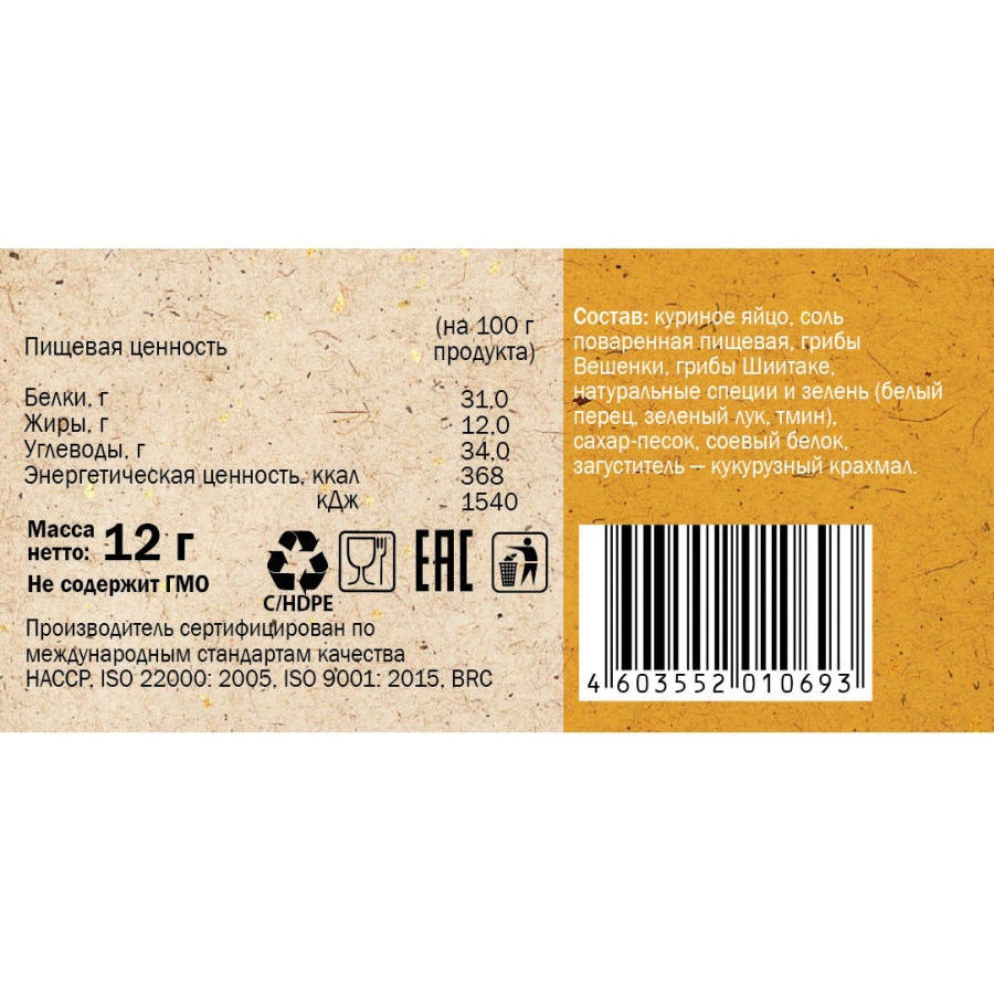 Основные ингредиенты куриное яйцо, соль поваренная пищевая, грибы вешенки, грибы шиитаке, специи. Превосходный изысканный вкус, тщательный подбор составляющих для каждого рецепта. Только натуральные ингредиенты, без искусственных красителей, ароматизаторов и консервантов. Уникальная технология freeze-drying позволяет сохранить до 95 процентов полезных микроэлементов и витаминов. Готовится за 1 минуту, просто добавьте 270 мл горячей воды.