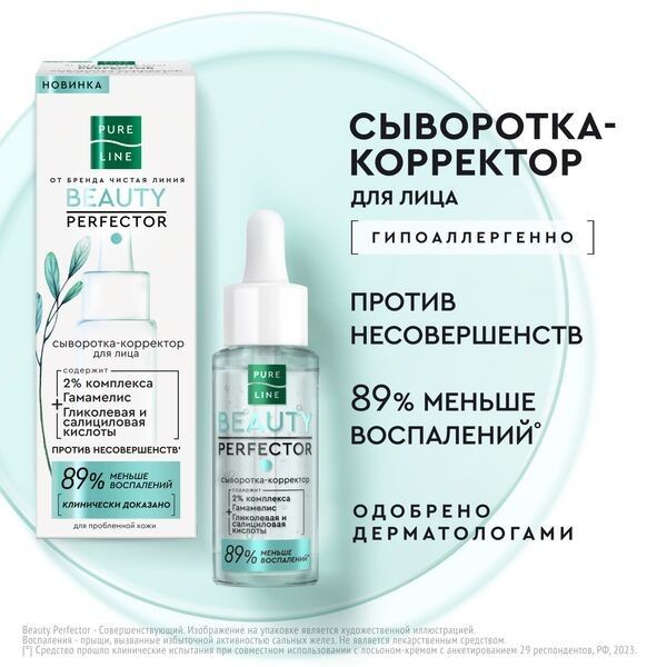 Попробуйте новую программу для лица Pure Line Beauty Perfector от бренда Чистая Линия. Она создана специально для ухода за проблемной кожей лица и тела, склонной к прыщам и акне. Клинически доказано: 89% – меньше воспалений. Сыворотка-корректор ЭФФЕКТИВНО И БЕРЕЖНО УХАЖИВАЕТ ЗА КОЖЕЙ ЛИЦА, действуя сразу в нескольких направлениях: Успокаивает; Восстанавливает; Оказывает себорегулирующий эффект. АКТИВНЫЕ ИНГРЕДИЕНТЫ: Экстракт гамамелиса снижает раздражение и покраснение, сокращает жирный блеск. Гликолевая и салициловая кислоты борются с воспалениями и сокращают следы постакне. Свойства сыворотки подтверждены в ходе потребительского тестирования. Заметный результат за одну неделю: 92% респондентов отметили, что рельеф кожи стал более гладким; 96% – визуально менее заметны черные точки и расширенные поры; 92% – менее заметны следы постакне. Гипоаллергенно. Подходит для всех типов кожи: сбалансированной, комбинированной, жирной, сухой и чувствительной, в том числе для подростков с 14 лет. Для наилучшего результата используйте всю программу уходовой косметики для лица и тела Beauty Perfector. Начните с очищающей пенки, для лица и тела используйте лосьон-крем, для ухода за лицом используйте сыворотку-корректор. Продукты серии усиливают действие друг друга. Кожа успокаивается, улучшается ее микрорельеф, нормализуется выработка кожного сала. Эффективны от воспалений не только на лице, но по всему телу, в том числе на спине и в зоне декольте.