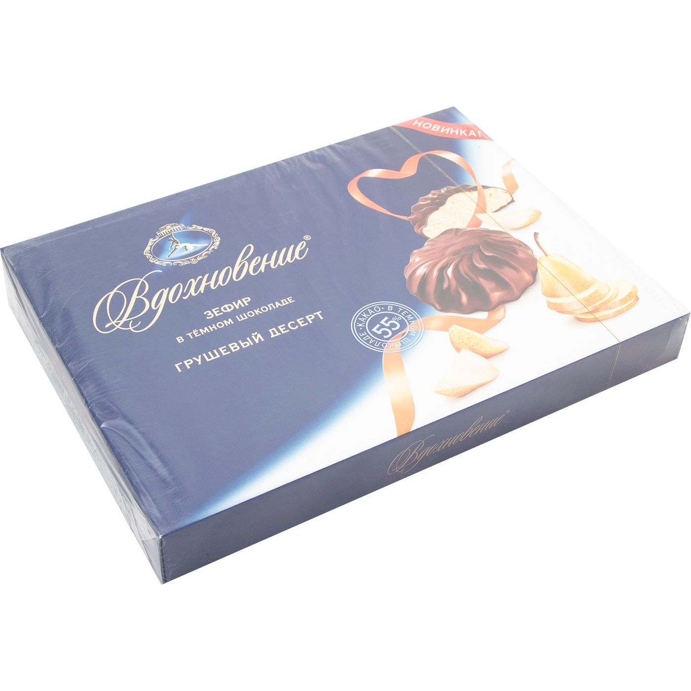 Зефир, который дарит вдохновение. Нежный и воздушный, с дурманящим гушевым ароматом. В темном шоколаде, который покрывает зефир "Вдохновение", содержится 55% какао. Он добавляет яркую терпкую нотку в тающую зефирную сладость. Зефир тает во рту, оттеняется легкой фруктовой кислинкой, а необычный для зефира гушевый аромат навевает настроение летнего блаженства.