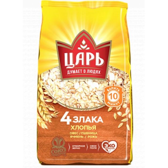 Хлопья "Царь" 4 злака содержат хлопья овса, пшеницы, ячменя и ржи. Хлопья богаты клетчаткой, растительными белками, содержат витамины группы В и комплекс минеральных веществ: калий, фосфор, магний. Мы используем технологию сохранения витаминов, содержащихся в зерне и оболочке зерна. Продукт становится еще полезнее и вкуснее.