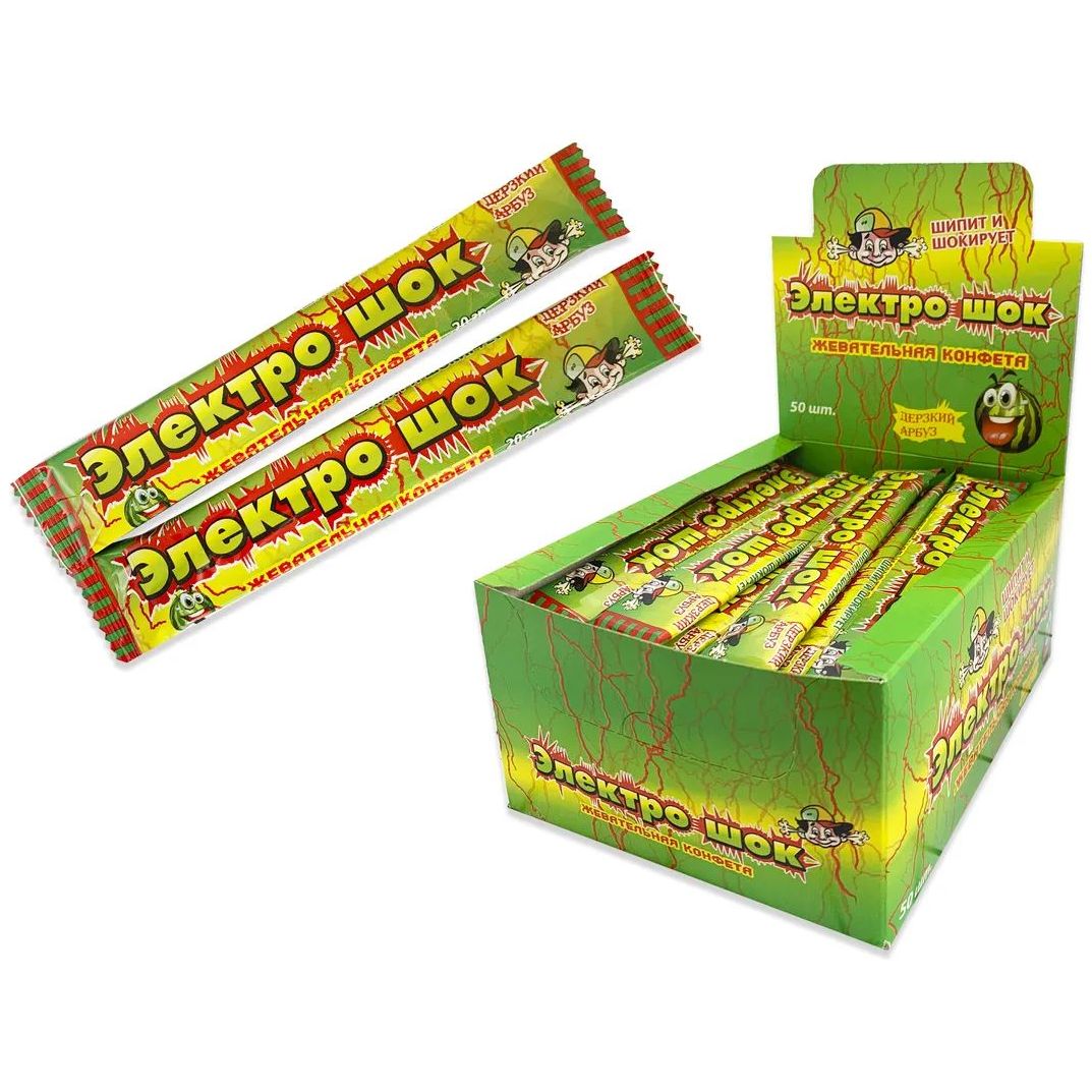 Длинная жевательная конфета "Электрошок" с ароматом арбуза. Яркий вкус конфеты удивит и шокирует вас, спешите попробовать невероятно сладкий арбуз!