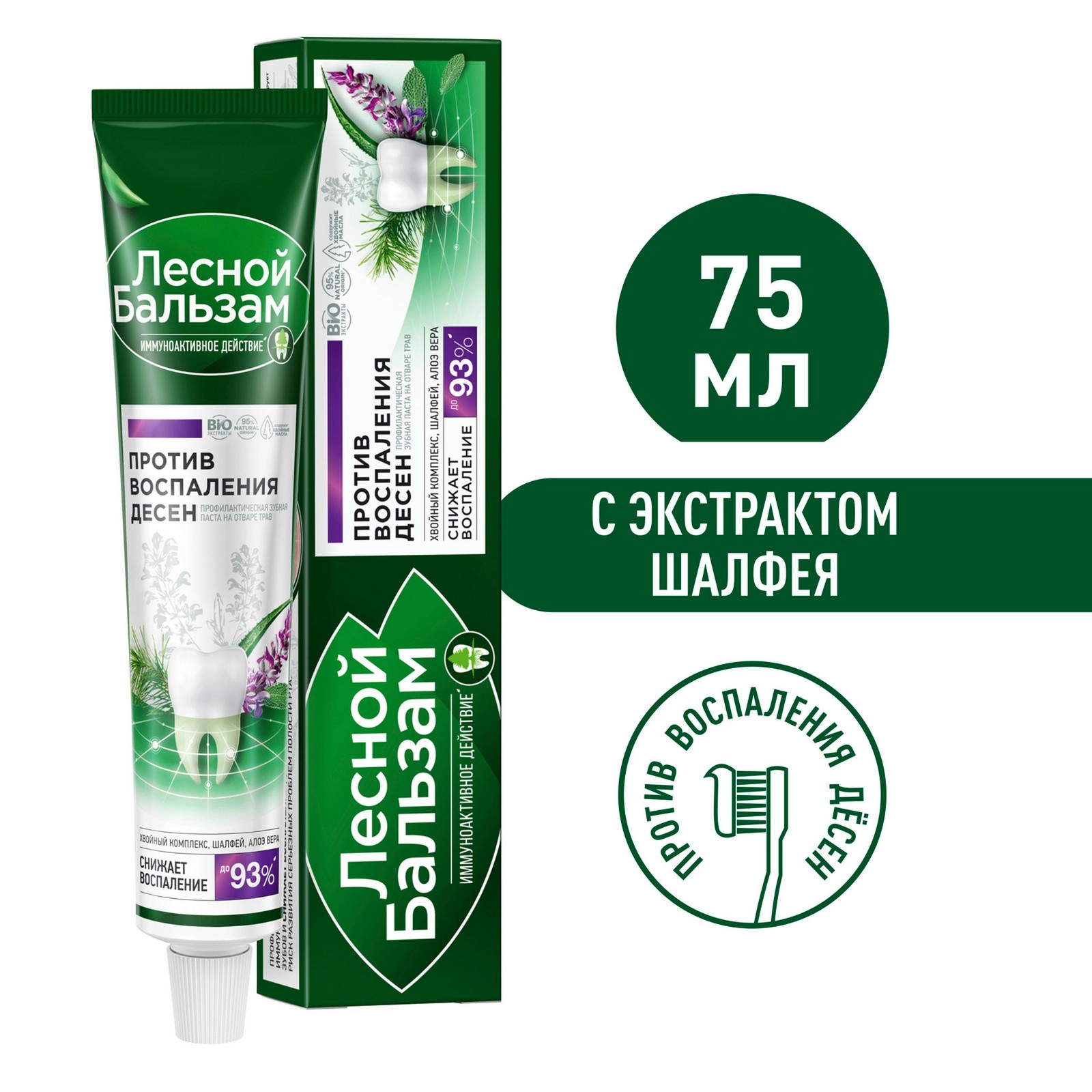 Профилактическая зубная паста "Лесной бальзам" на отваре трав c иммуноактивным действием помогает решить проблему воспаления дёсен и в 2 раза улучшает работу собственного иммунитета полости рта, снижая риск развития проблем с дёснами.